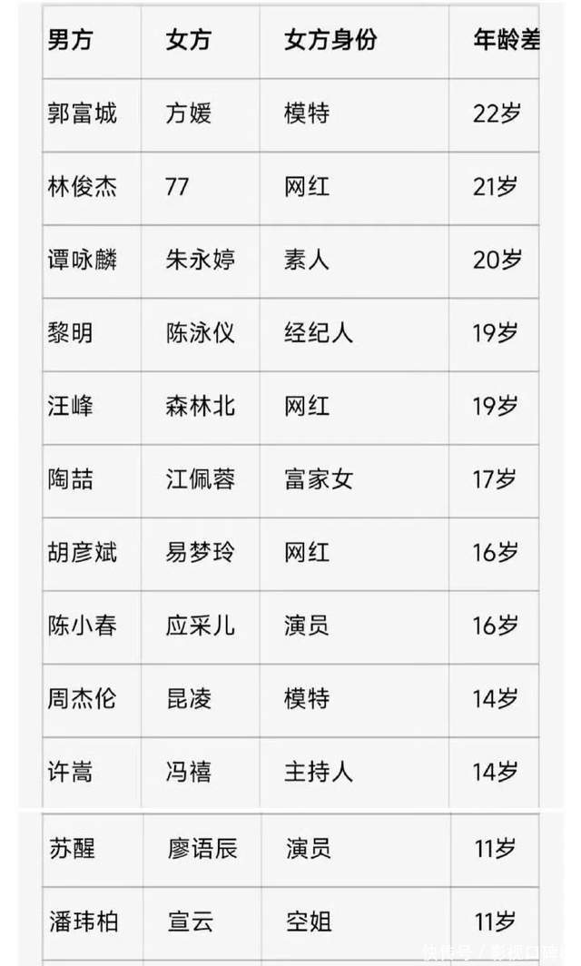 郭富城娶了比方媛小22岁的模特方媛;周杰伦和昆凌相差14岁;潘玮柏的妻子宣云是空姐;汪峰和森林北相差19岁,女方也是网红;胡彦斌和易梦玲相差16岁,易梦玲同样是网红出身等等。